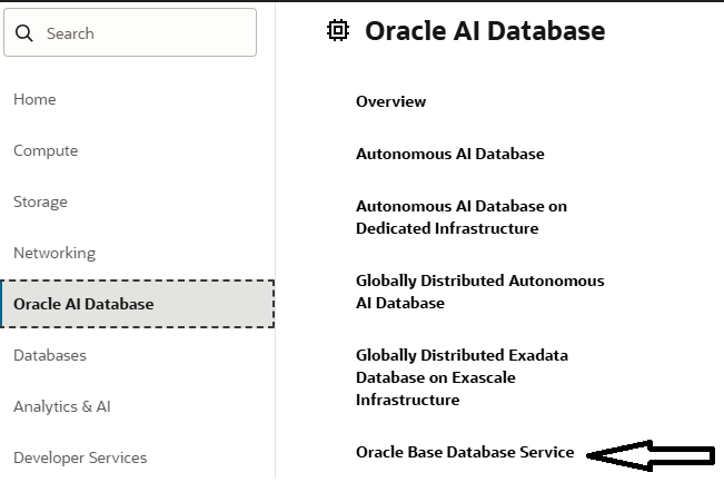 Posteriormente pulsamos sobre la opción Oracle AI Database y posteriormente en Oracle Base Database Service.