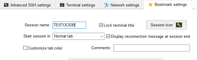 En la pestaña Bookmark settings, podemos poner un nombre identificativo a la sesión, en Sesion Name, le indicamos TESTOCIDB para identifcarlo y pulsamos OK.