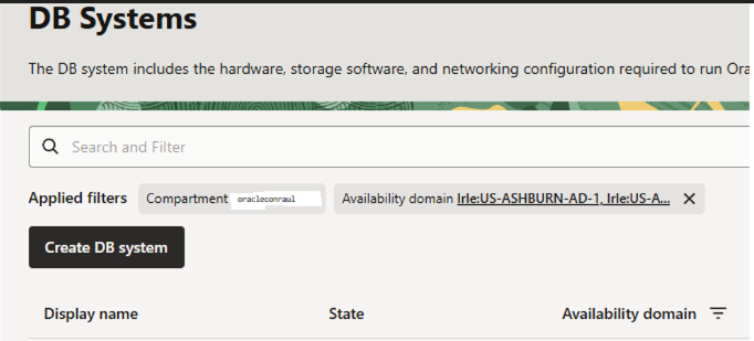 Elegimos el compartment sobre el que se desplegará nuestra base de datos y pulsamos sobre el botón Create DB system.