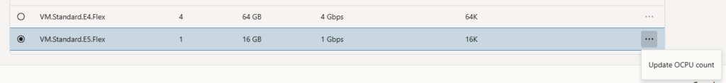 - c. Shape: Pulsamos en «Change Shape». Seleccionamos AMD, VM.Standard.E4.Flex, pulsamos sobre los tre puntos y elegimos «Upate OCPU» y lo ponemos en 1.